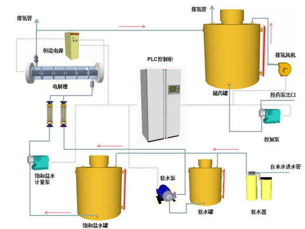 次氯酸钠由电解稀盐水制备。我司的次氯酸钠发生器由若干个系统组成,包括软水制备、溶盐系统、稀盐水配置系统、电解槽、整流电源、次氯酸钠贮存系统、排氢系统、酸洗系统、次氯酸钠投加系统、配电控制系统以及辅助热交换系统。